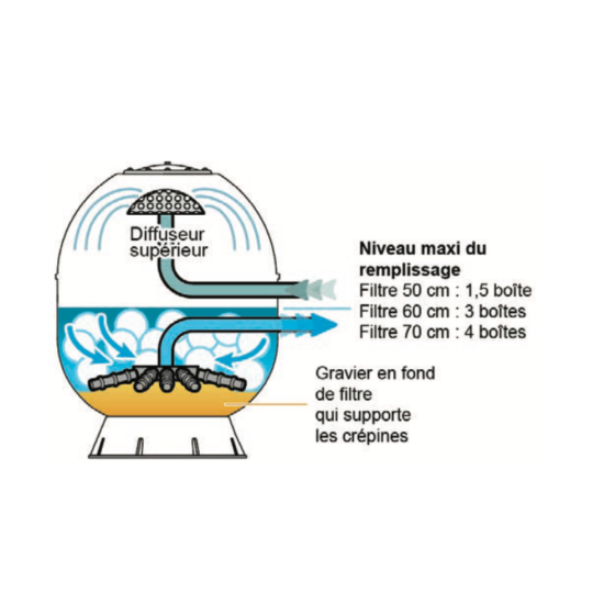 Les filtres ne possédants pas de diffuseur doivent être équipés d'un grille pour éviter que les boules ne se coincent pendant les contre-lavages. Sans cette grilles les boules Silverloon remontent vers le haut du filtre et pourraient être évacuées à l'égout.
